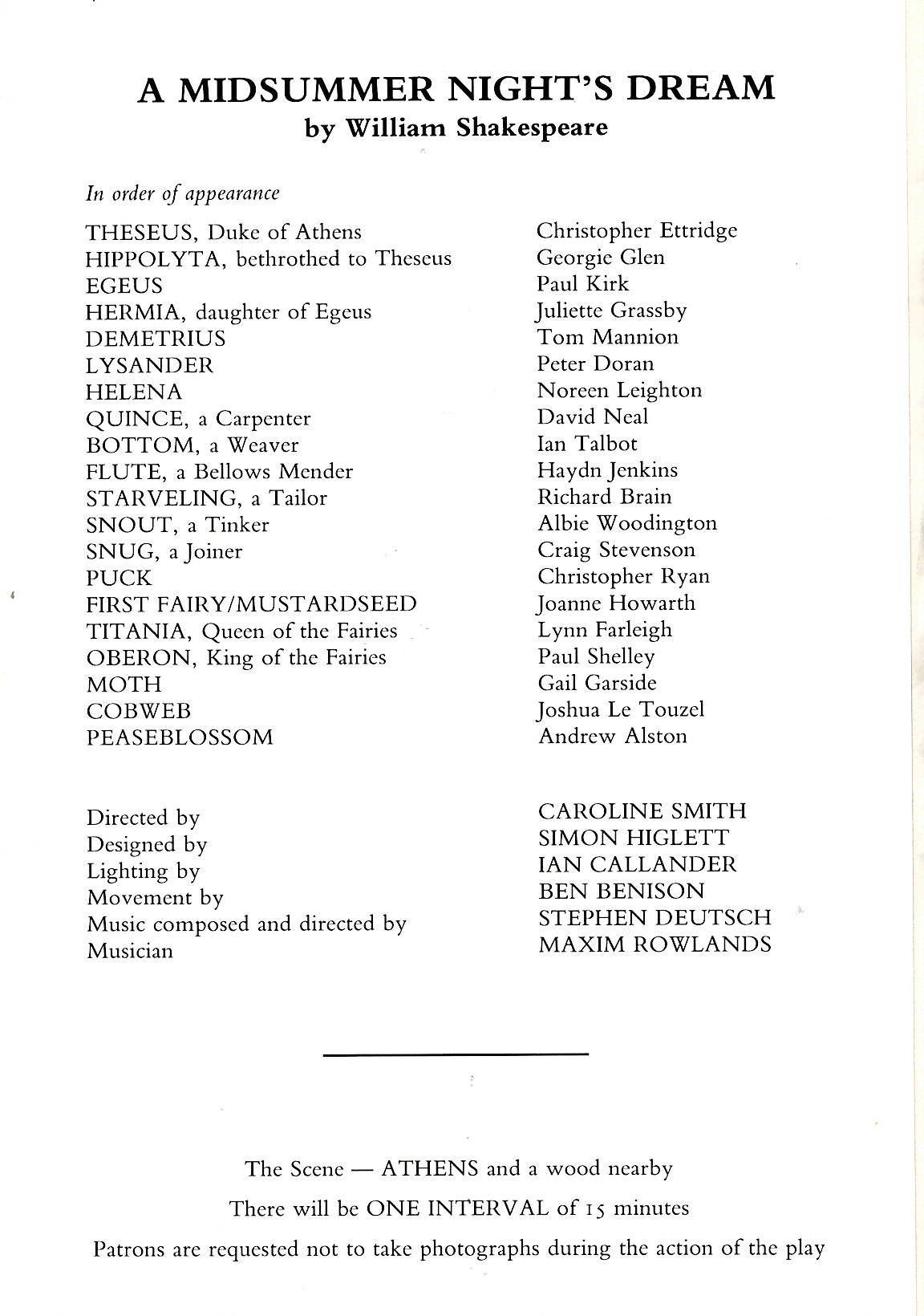 Caroline Smith directed the 1987 production of A Midsummer Night's Dream, which featured Ian Talbot as Bottom.