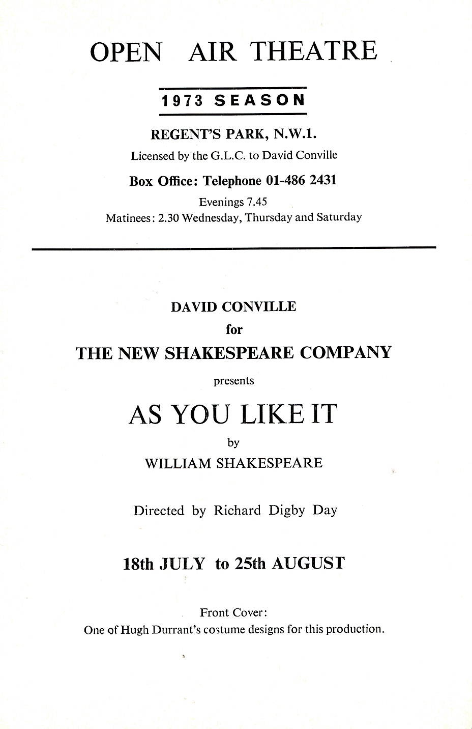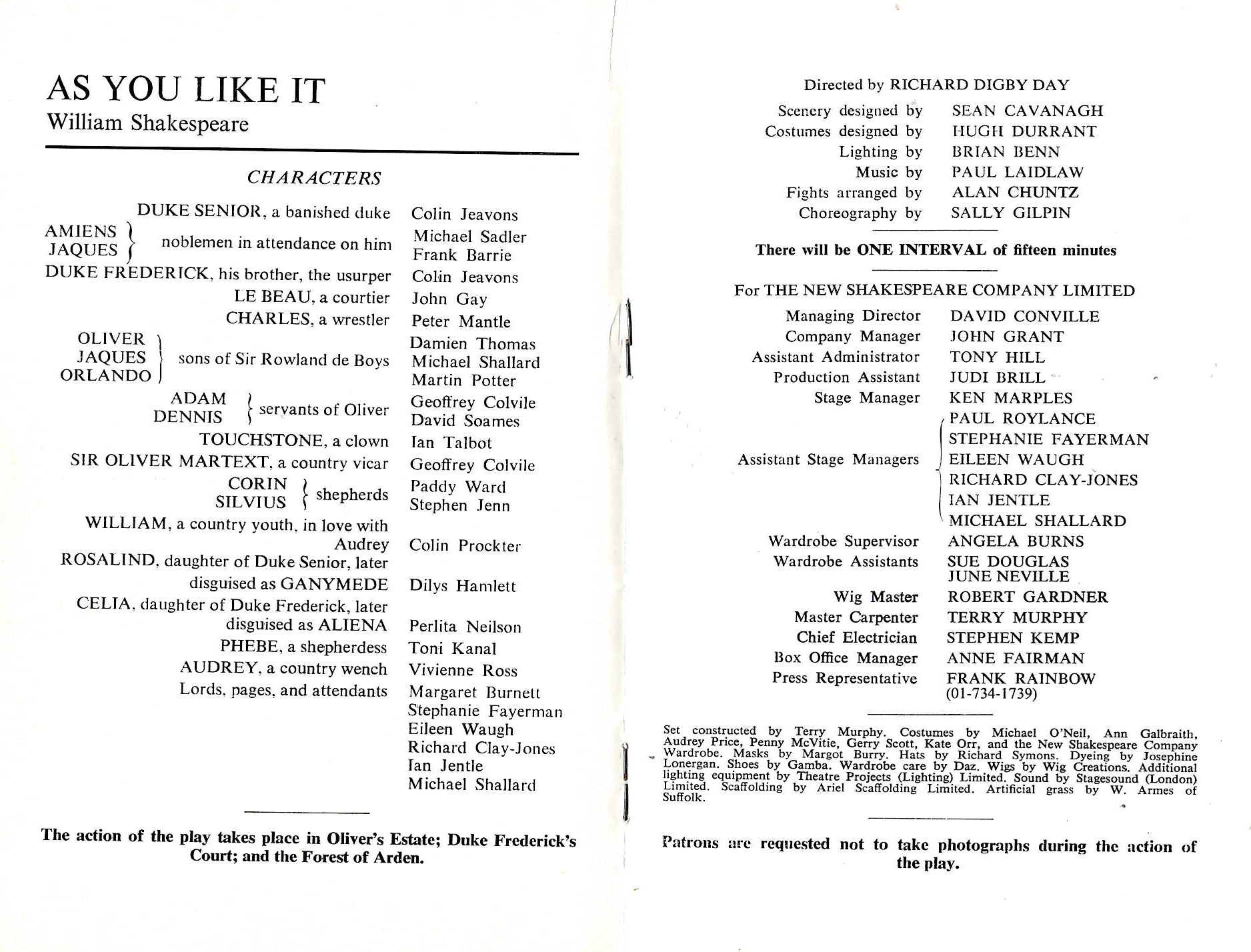 Richard Digby Day directed this 1973 production of As You Like It. Orlando was played by Martin Potter and Rosalind by Dilys Hamlett, with Ian Talbot appearing as Touchstone.