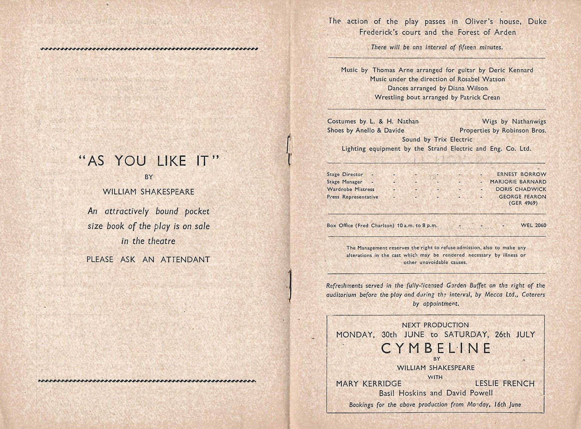 Ernest Borrow directed the 1952 production of Shakespeare's As You Like It at Regent's Park.