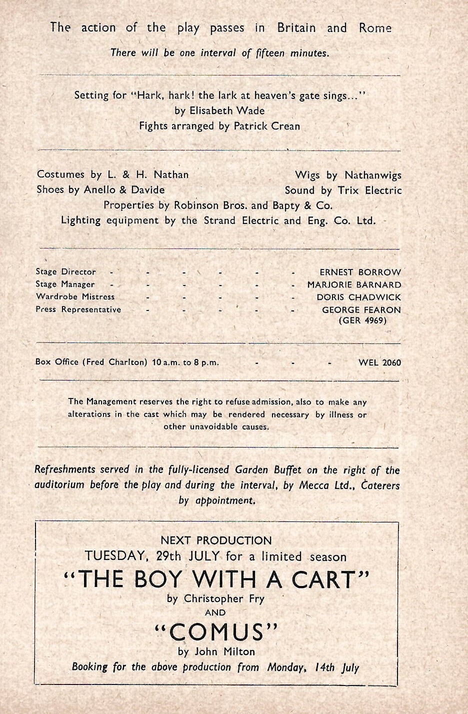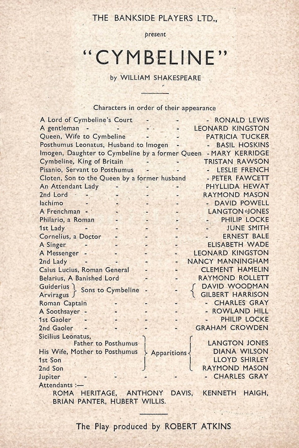Robert Atkins directed the 1952 production of Cymbeline, which featured several seasoned Open Air Theatre performers including Leslie FrenchLeslie French and Clement Hamelin.