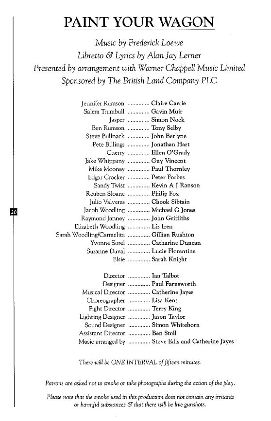 Ian Talbot directed this 1996 production of the Lerner and Loewe musical. Tony Selby earned a Best Supporting Performance in a Musical nomination at the Olivier Awards for his performance as Ben Rumson.