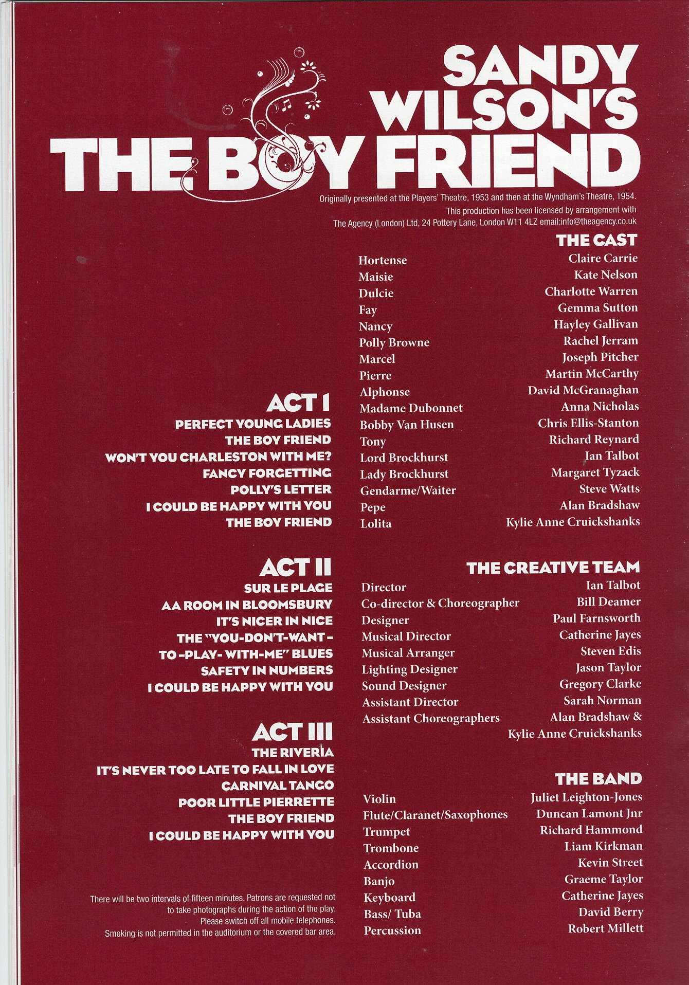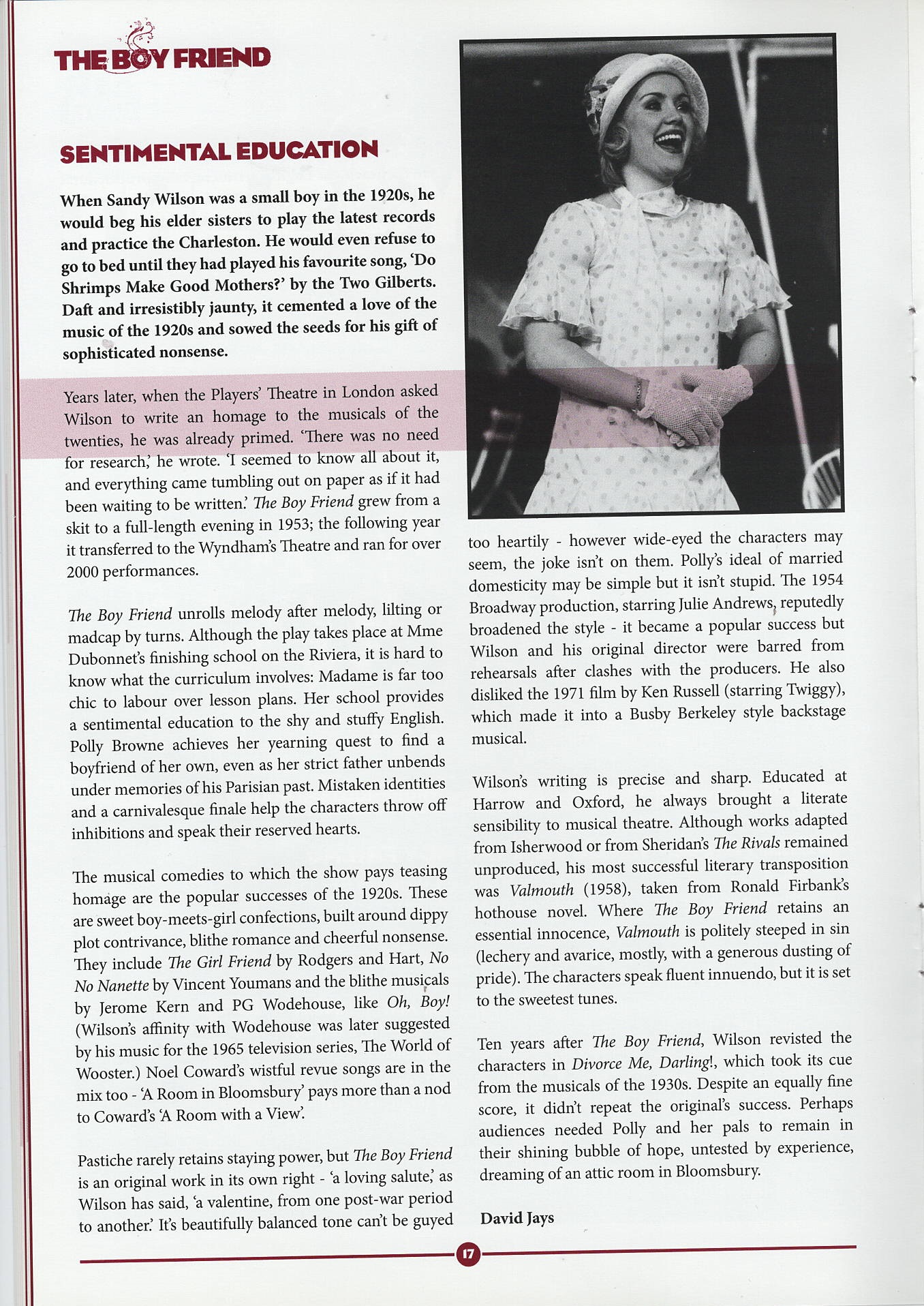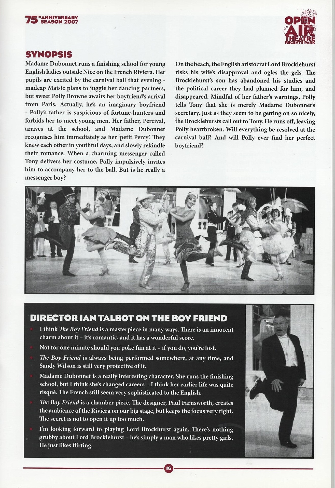 Following two Olivier Award nominations and huge popular demand, the 2006 production of The Boy Friend was revived as part of the 2007 season. Rachel Jerram returned to play Polly Browne.
