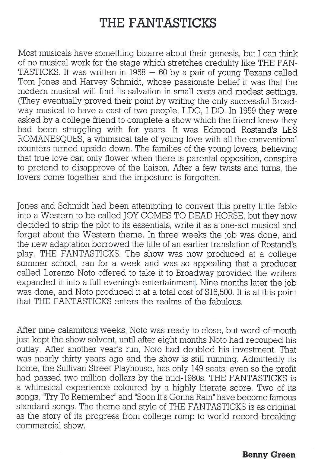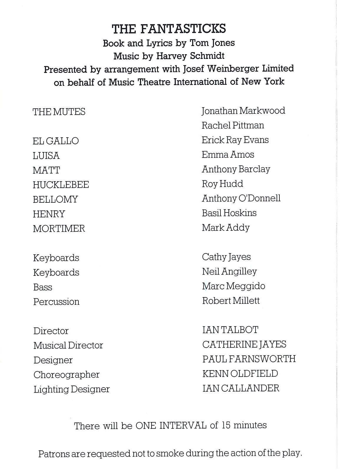 In celebration its 30th Anniversary off-Broadway in 1994, Ian Talbotdirected a production of the musical The Fantasticks. The theatre had previously produced the play on which the musical is based (The Romanticks), most recently in 1956. Following the 1994 season, with an Arts Council grant, the production embarked on a six-week tour in the Autumn.