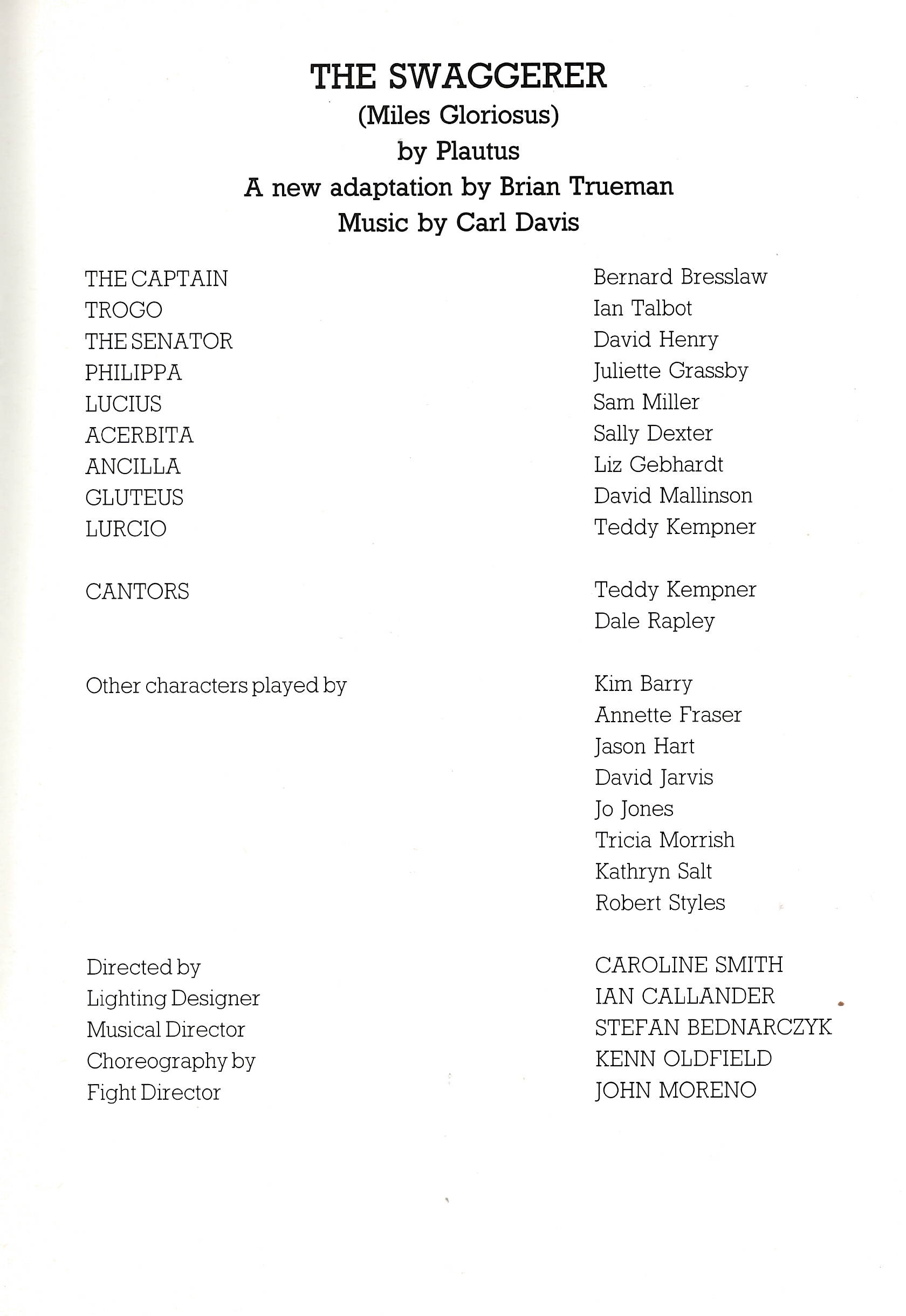 Caroline Smith directed the 1989 production of The Swaggerer, which featured Bernard Bresslaw as The Captain and Ian Talbot as Trogo. This was a new adaptation of Plautus' play by Brian Trueman with music by Carl Davis.