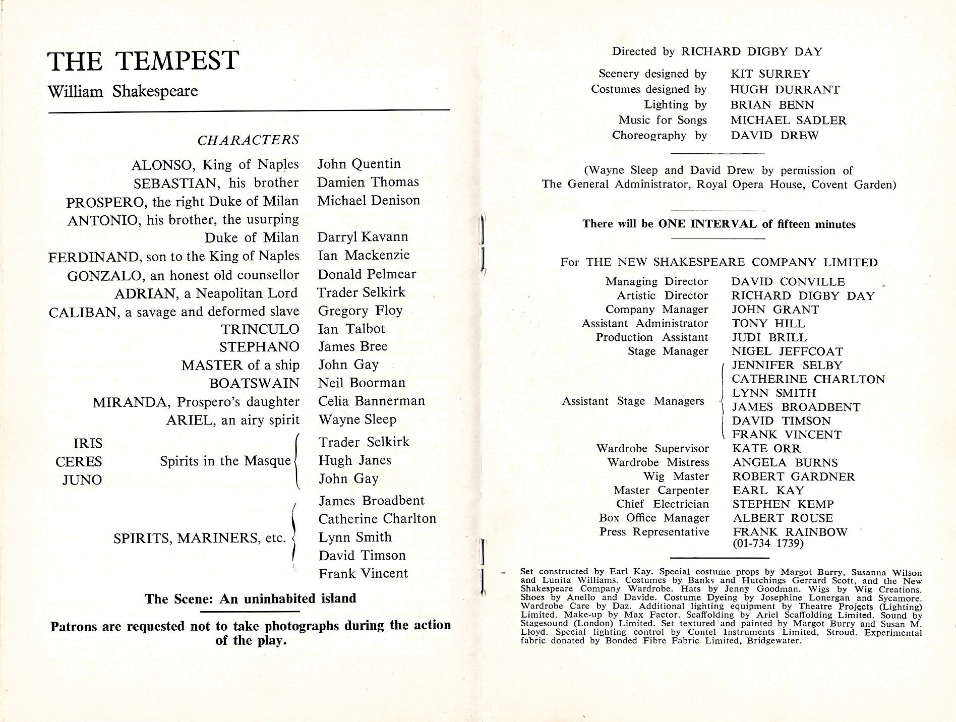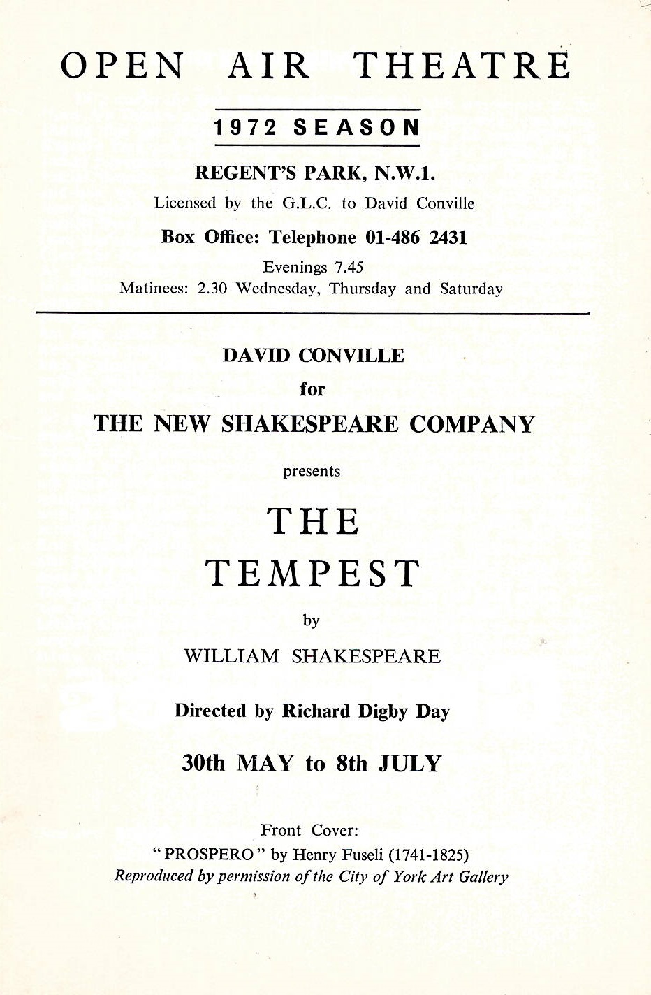 The 1972 production of The Tempest was directed by Richard Digby Day and featured Wayne Sleep as Ariel.