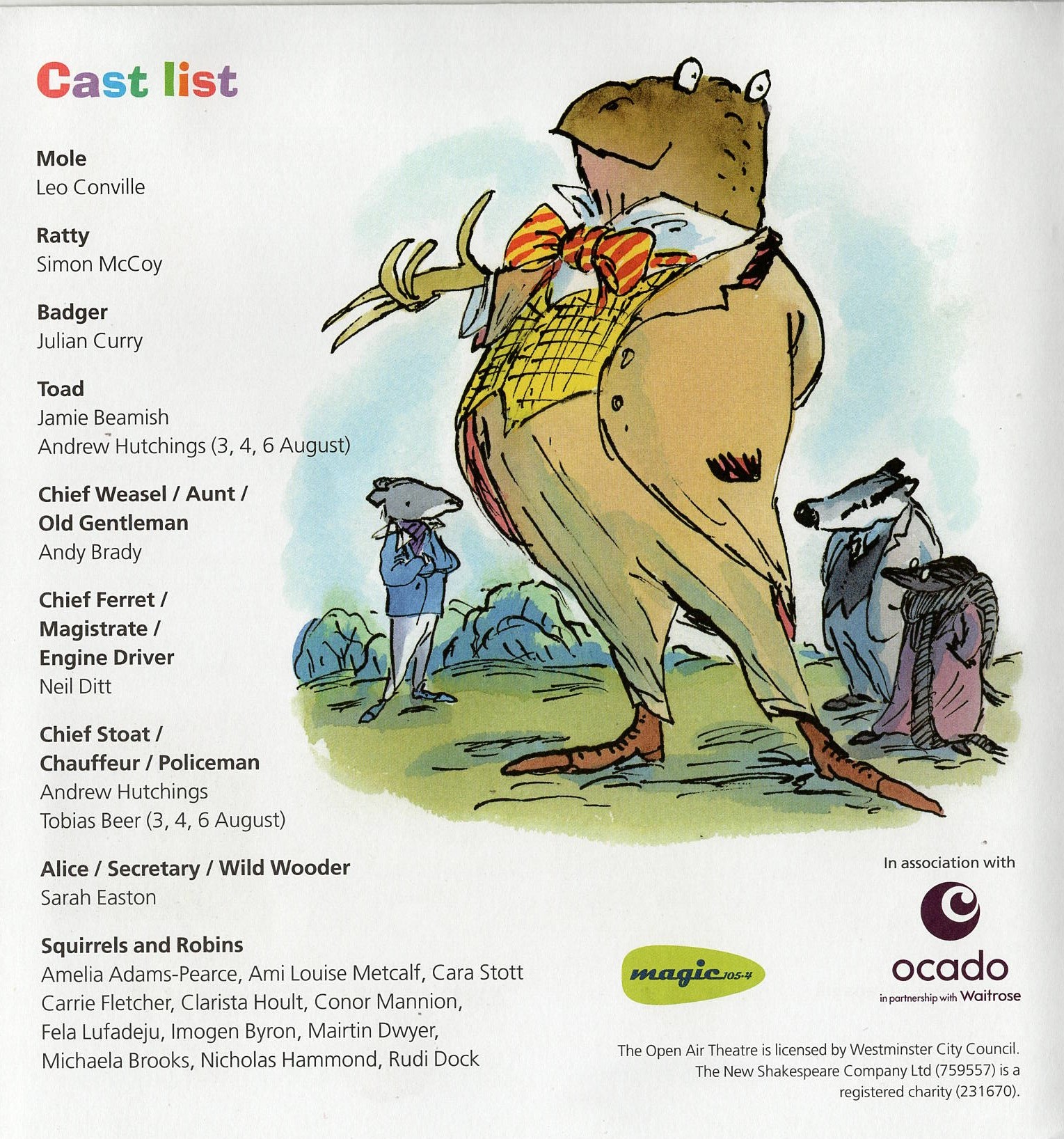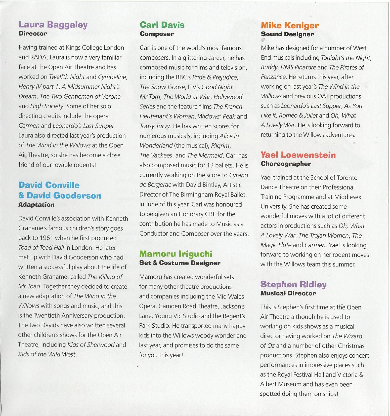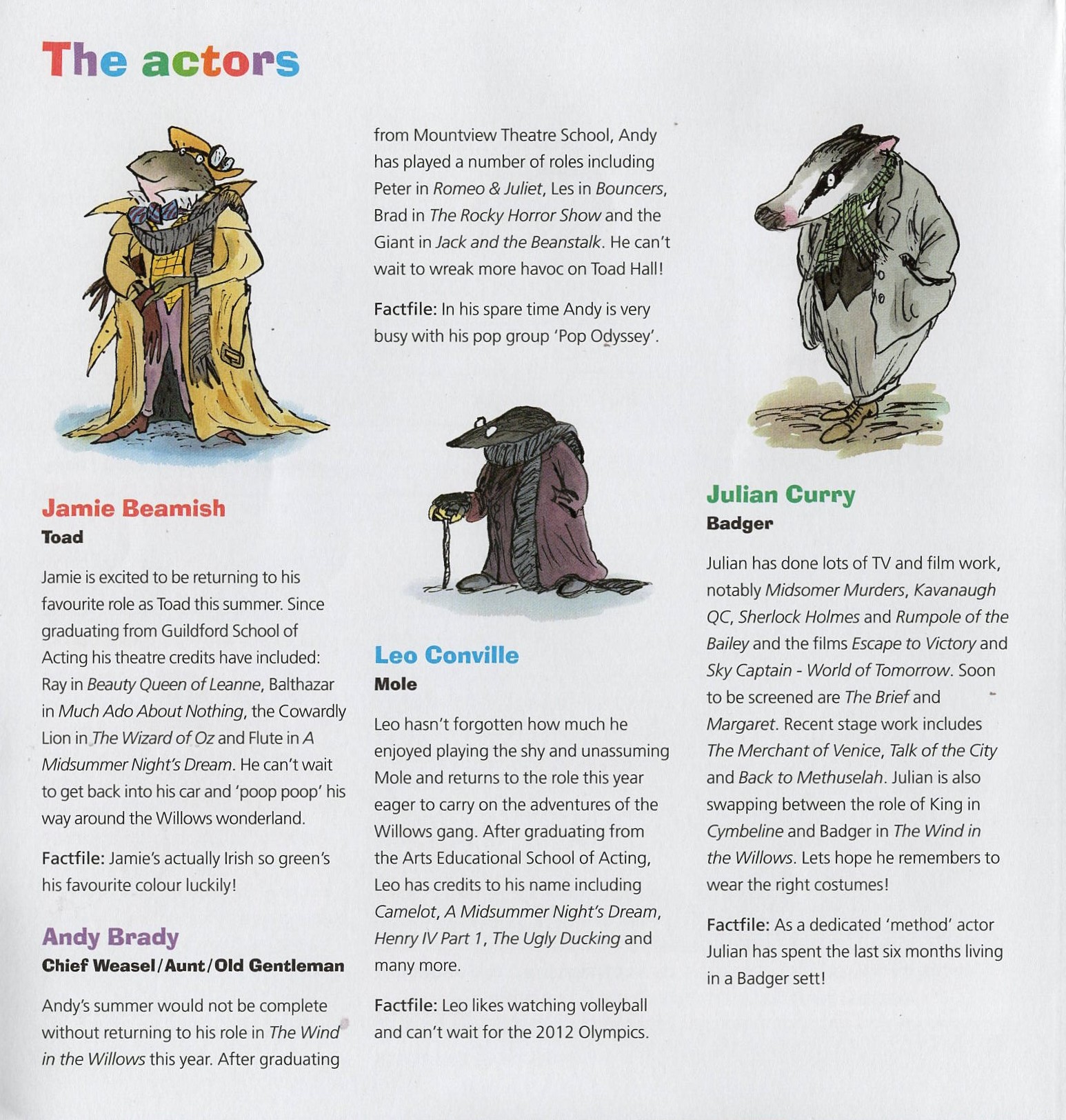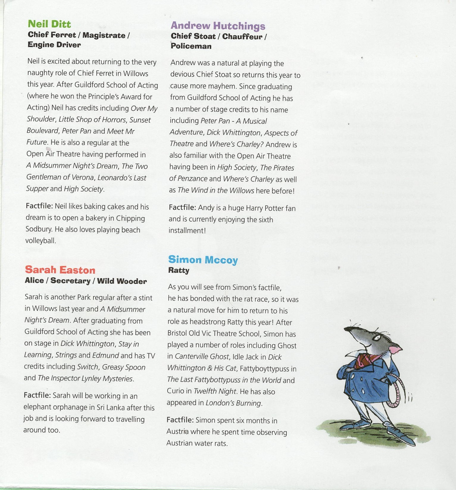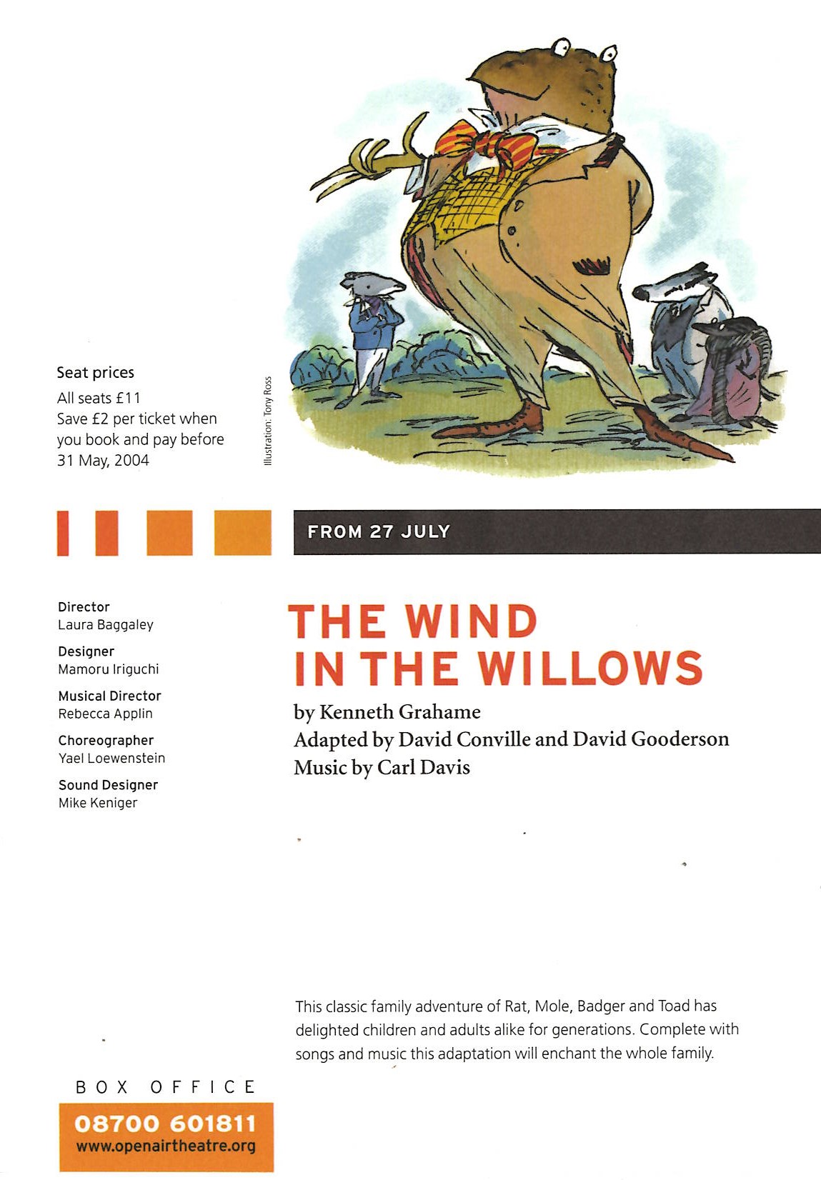 Laura Baggaley directed The Wind in the Willows , a classic family adventure following the animals Rat, Mole, Badger and Toad. Jamie Beamish played Toad and the award-winning Carrie Hope Fletcher made her debut at the Park as a Child Actor. Complete with songs and music, this adaptation was a sell-out success and was revived the following year, in the 2005 season.